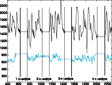 Здесь показаны интенсивность сигнала и порог срабатывания. По осциллограмме можно сказать, что этот блок работает нормально, так как при приеме последовательности цифр значение интенсивности устойчиво превышает значение порога, во время паузы значение интенсивности строго ниже значения порога, а при приеме гудка (продолжительного отрезка гармонического колебания) через некоторое время порог оказывается выше интенсивности сигнала.
