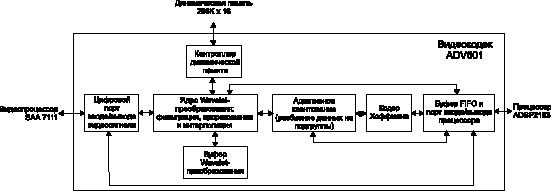 Высокая степень сжатия позволяет поместить видеосигнал в низкоскоростной канал связи (ISDN или телефонная линия). Реально нам удалось передать видеосигнал по обычной телефонной линии, сохраняя высокое качество картинки, на расстояние 2,5 км. Основные функциональные блоки кодека ADV601 показаны на рис. 3.