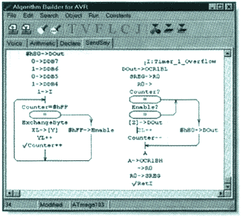 В данной публикации я хотел поговорить о технологии графической разработки программного обеспечения для микроконтроллеров и микропроцессоров. Такая технология освобождает программиста от целого ряда неудобств, свойственных классическому ассемблеру, а также предполагает существенное упрощение работы при сохранении уровня его детализации. Рассмотрение темы я буду вести с использованием в качестве примера среды разработки "Algor ithm Builder", в частности адаптированной под микроконтроллеры фирмы ATMEL с архитектурой AVR.
