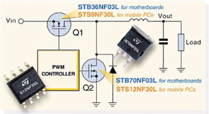 STripFETДругое новое семейство полевых транзисторов фирмы STMicroelectronics - STripFET. Это низковольтные MOSFET-транзисторы с очень низкой величиной заряда затвора Qg. Для применения в высокочастотных схемах величина Qg играет более важную роль в минимизации потерь мощности, чем RDS ON. В этих целях использование STripFET-технологии более приемлемо, чем традиционной структуры кристалла или, например, Trench-технологии, предлагаемой азиатскими производителями. STripFET-технология представляет собой лучший компромисс между динамическими характеристиками, напрямую связанными с зарядом затвора, и потерями на проводимость (RDS ON). Рисунок 3. STripFET2 в корпусе PowerSO-10 в синхронных понижающих преобразователях