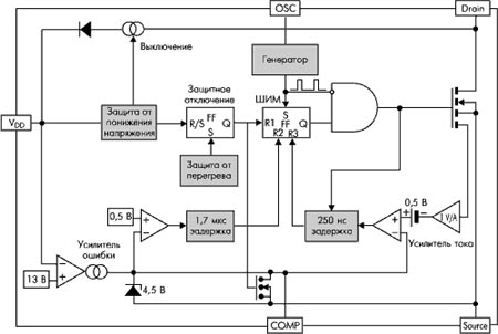 М. Тимофеев Высоковольтные ШИМ-контроллеры фирмы STMicroelectronicsНаряду с известными микросхемами семейства TOPSwitch фирмы Power Integrations [1], значительное место на рынке занимают компоненты фирмы STMicroelectronics - высоковольтные ШИМ-контроллеры семейства VIPer (VIPer20, VIPer50, VIPer100) и ШИМ-контроллеры L6590, L6590A для построения импульсных блоков питания от 5 до 100 Вт в диапазоне входных напряжений от 85 до 265 В сети переменного тока. В устройствах семейства VIPer в одной микросхеме интегрированы высоковольтный (700 В) МОП-транзистор и контроллер широтно-импульсной модуляции (ШИМ). Микросхемы VIPer включают в себя все функции, необходимые для построения импульсного источника электропитания: мощный МОП-транзистор, ШИМ-контроллер, высоковольтная цепь запуска, цепи компенсации и защиты по току и температуре. Конструктивно микросхема выполнена в 5-выводном корпусе Pentawatt (ТО-220-5) или в корпусе для поверхностного монтажа PowerSO-10. Корпус PowerSO-10 - фирменная разработка STM, он обеспечивает превосходный отвод тепла, его тепловое сопротивление составляет 50оС/Вт. Основные области применения микросхем семейства VIPer - бытовая электроника с потреблением энергии до 100 Вт (телевизоры, компьютеры, мониторы, видеомагнитофоны, аудиоусилители), различные зарядные устройства (для радиотелефонов, сотовой телефонии, видеокамер), импульсные источники питания, компьютерная периферия и так далее. ШИМ-контроллеры L6590, L6590A построены аналогично VIPer. Основные отличия - встроенный генератор 65 кГц, защита от понижения напряжения сети, переход на частоту переключения 22 кГц в дежурном режиме и пониженное потребление в н╦м. Они предназначены для источников питания мощностью до 15 Вт и скорпусированы соответственно в DIP8 и SO16. Основные области применения микросхем L6590 - это сетевые адаптеры, дежурные источники питания для мониторов (соответствующие стандарту потребления Blue Angel), факсов, телевизоров, принтеров и так далее. Блок-схема ШИМ-контроллеров L6590, L6590A и схемотехническое построение источника питания на базе L6590A приведены на рис. 1 и 2. Рассмотрим основные особенности микросхем семейства VIPer: