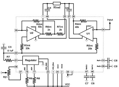 • Двухканальный выходной усилитель (рис. 2) с подключением двух заземл╦нных нагрузок Rload1, Rload2 через разделительные конденсаторы C1, C2 с максимальным током по каждому выходу 1,5 мА. При использовании только одного канала ток потребления в режиме холостого хода можно уменьшить до 220 мкА.