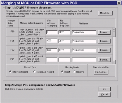 Если мы будем "щелкать" по каждому из сигналов выбора чипа в списке, то увидим, что они все были определены согласно карте памяти на рисунке 9. Уравнения логики Ввода - вывода и вкладки "User-defined Equations" используются для внедрения комбинаторной и последовательной логики общего назначения. Эти разделы более подробно рассмотрены в Руководстве пользователя "PSDSoft Express". Для того чтобы увидеть, как программно-аппаратное обеспечение DSP может быть загружено в DSM через программный файл данных (.obj), щелкним "Done". Загрузка программного обеспеченияя ADSP в DSM Теперь, когда мы завершили определение внутренних и внешних сигналов DSM, пришло время загрузить программно-аппаратное обеспечение ADSP в DSM. Чтобы выполнить это, сделаем следующие шаги: