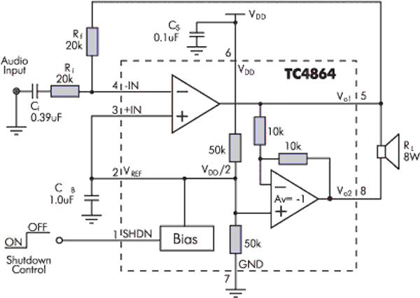 М. Еременко Новые аналоговые и интерфейсные микросхемы фирмы Microchip (продолжение)В ╧4 журнала мы рассказывали о новых аналоговых и интерфейсных микросхемах фирмы Microchip. В этом номере мы продолжаем рассказ и начн╦м с микросхем усилителей звука. Усилители ЗЧ Среди широкой номенклатуры аналоговых компонентов, выпускаемых компанией Microchip, есть специализированная микросхема усилителя ЗЧ - TC4864 - достаточно нетрадиционная ИС для фирмы, специализирующейся на производстве микроконтроллеров. Функционально TC4864 состоит из двух операционных усилителей (рис. 1). Выводы первого доступны для подключения внешних элементов, задающих режим работы. Второй усилитель включен по инвертирующей схеме с единичным усилением. Коэффициент усиления первого ОУ определяется сопротивлением резисторов Rf, Ri в цепи обратной связи, для второго он ж╦стко задан внутренними резисторами по 10 кОм. На рисунке видно, что выход ОУ1 является входом ОУ2, в результате на выходе 8 получаем сигнал, равный сигналу на выходе 5, но сдвинутый на 180 градусов. Соответственно, дифференциальное усиление на выходе равно Avd = 2*(Rf/Ri). Рисунок 1. Функциональная схема TC4864 - усилителя ЗЧ