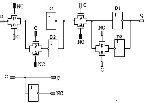 В КМОП БИС используют ЭП как на основе простейших бистабильных ячеек, так и на основе более сложных триггеров D-типа. Основным типом ЭП является синхронный D-триггер, тактируемый уровнем синхросигнала. Построение ЭП на основе логических элементов типа И-НЕ в КМОП БИС малоэффективно из-за большого числа компонентов и большой площади, занимаемой на кристалле. Поэтому для использования в БИС высокой сложности берутся усовершенствованные варианты электрических схем D-триггеров, тактируемых уровнем сигнала. D-триггеры на основе проходных ключей Схема D-триггера, тактируемого уровнем на основе двух коммутируемых проходных ключей (первый, входной на транзисторах VT1, VT2; второй, обратной связи на транзисторах VT3, VT4), показана на рис. 10а. Транзисторы VT1√VT4 образуют мультиплексор, инверторы D1 и D2 - бистабильную ячейку. Для тактирования используется двухфазная синхронизация C, NC. Допустим, что на вход C подан высокий уровень сигнала, на вход NC - низкий. Тогда вход ной ключ открыт и переда╦т сигнал со входа D через инвертор D1 на выход Q в инверсной форме, далее через инвертор D2 поступает на выход Q в прямой форме. Рисунок 10. D-триггер, тактируемый уровнем на основе двух коммутируемых проходных ключей: а) двухфазное тактирование; б) однофазное тактирование