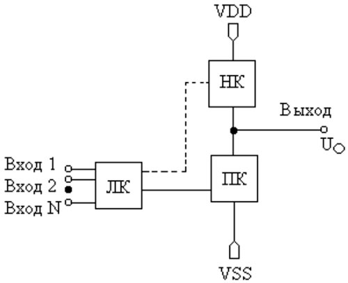 В диодно-резисторной сборке (VD1, VD2, R) диод VD2 является самостоятельным элементом конструкции, а диод VD1 составляет единое целое с резистором R. Мощные транзисторы VT1 и VT2, реализующие функцию "выход" при работе на магистраль, формируются пут╦м параллельного включения p-МОП (VT1) и n-МОП (VT2) транзисторов, что обеспечивает набор эффективной ширины каналов. Четыре параллельно включенные p-МОП транзистора дают ширину около 400 мкм, в то время как типичная ширина канала ядра ячейки может составлять величину 7 мкм. Литература