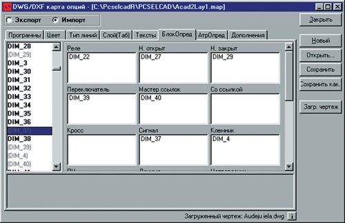 Кроме этого, программа может сгенерировать и включить в состав проекта ещ╦ один тип отч╦та - черт╦ж блока (устройства, узла, прибора и так далее) с размещ╦нной на н╦м спецификацией отдельных частей, составляющих этот блок. Эта форма отч╦та да╦т дополнительную информацию о конструктивном исполнении комплектующих и, в этой связи, возможностях их механического монтажа (например, черт╦ж лампового разъ╦ма или сенсорного датчика). Позиционные обозначения (имена символов)Для позиционного обозначения УГО на принципиальных схемах могут быть применены различные стандарты, в частности, EN 61346 (аналог ГОСТ 2.710-75), когда в позиционном обозначении содержится информация о функциональной и конструктивной принадлежности элемента к той или иной группе. Данный порядок обозначений может быть применим для всего проекта, для его отдельной страницы или отдельно выделенной области на странице. Отч╦тная документация в этом случае генерируется программой автоматически согласно принятому стандарту. Разделы проектаСтраницы проекта могут быть распределены по специально созданным разделам, с переходом от одного к другому по одному щелчку мыши, что актуально для многостраничных проектов. Для этого используются специальные типы страниц, которые содержат названия раздела и/или список его страниц. Импорт/экспорт файловДля операций импорта/экспорта файлов проекта в другие системы используются форматы dxf/dwg. При экспорте файлов DWG можно определить, в какую из версий AutoCAD (13, 14, 2000 или др.) будет выполняться конвертация файла. Следует отметить, что при конвертации теряется вся электротехническая специфика проекта, то есть все объекты в н╦м будут нести только графическую информацию. Процедура импорта/экспорта, как правило, индивидуальна для каждого файла, так как на практике объекты (цвет и тип линий, блоки и их атрибуты и пр.) могут быть по-разному определены в других системах и тем или другим исполнителем. Поэтому в программу введ╦н специальный модуль "Карта опций для DWG/DXF", который позволяет сделать индивидуальную настройку для каждого объекта импорта/экспорта и сохранить е╦ в виде соответствующего форматирующего *.map-файла. В дальнейшем, зная источник dwg-файла, останется только выбрать созданный под него *.map-файл. Интересно отметить, что при импортировании по этой методике электрических схем, созданных в DWG-формате, программа может их "электрофицировать". Рисунок 9. Программный модуль управления импортом/экспортом dwg/dxf-файлов