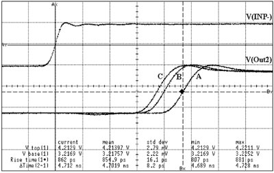 Рисунок 4. Выходной сигнал коммутатора V(Out2) при превышении порога на: A) 10 мВ, B) 100 мВ, C) 1 В. V(INP-) - входной реперный сигнал. Масштаб: по горизонтали - 1 нс/деление, по вертикали для канала ╧ 1 - 500 мВ/деление V(Out2), для канала ╧ 2 - 50 мВ/деление V(INP-)