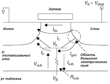 Моделирование элементов защиты от ESD на схемном уровнеОписание работы защитных устройств на схемном уровне позволяет оптимизировать работу элемента, не прибегая к дорогостоящим методам, требующим создания готовых изделий. Существующие программы аналогового моделирования, такие как SPIcE, могут быть использованы для разработки и усовершенствования современных схем защиты от ESD. Далее будет рассмотрено аналоговое моделирование ряда наиболее важных элементов защитной схемы, которое может быть применено в аналогичных SPIcE-программах. Соответствующие модели должны описывать работу схемы в режиме лавинного пробоя и режиме больших токов, так как именно эти режимы характерны для работы устройств под воздействием ESD. Модели также должны учитывать влияние топологии на сопротивление подложки, и в свою очередь, на работу устройства. Необходимо, чтобы параметры модели легко экстрагировались с помощью несложных вычислений. Моделирование nМОП-транзистораБольшинство существующих программ аналогового моделирования не позволяют описать работу полевого транзистора в режиме больших токов, в то время как анализ схем защиты от ESD на МОП-транзисторах и объединение схем защиты с внутренней логикой предполагает точное описание работы схемы при воздействии ESD. Поэтому необходимо задать уравнения работы транзистора в соответствующих режимах. Моделирование nМОП-транзистора должно включать в себя описание работы паразитного биполярного транзистора. Стандартные программы аналогового моделирования используют уравнения биполярных моделей, например, модели Гуммеля-Пуна, охватывающие нормальные режимы работы схем. Эти модели содержат ряд параметров, которые вычисляются исходя из информации, полученной при измерениях в нормальных условиях работы. Области ВАХ nМОП-транзистора схематично показаны на рис. 1. Крутая и пологая области работы полевого транзистора задаются стандартными уравнениями. Этими уравнениями нельзя описать область лавинного пробоя и низкоомную область, которые следуют за пологой областью. Плотности тока во время ESD обычно гораздо выше, чем при стандартных условиях работы nМОП-транзистора. Именно этим участком ВАХ описывается работа элемента во время ESD. На рис. 5 показана структура nМОП-транзистора с обозначением токов во время стресса. Лавинная генерация носителей в области большого электрического поля в районе стока приводит к значительному дырочному току подложки Isub. Падение напряжения на сопротивлении подложки Rsub, обеспечиваемое этим током, увеличивает локальный потенциал подложки Vsub и открывает тем самым переход исток√подложка. Электроны, инжектированные истоком в подложку, собираются стоком. Таким образом, формируется паразитный биполярный npn-транзистор, в котором эмиттером является исток, базой - подложка, а коллектором - сток. Эффективность этого транзистора определяется эффективностью эмиттера и коэффициентом переноса, который зависит от эффективной длины канала. Для описания поведения паразитного биполярного транзистора в такой структуре может быть использована модель Гуммеля-Пуна, дополненная рядом параметров. Это увеличивает число необходимых измерений и усложняет программы моделирования. Всю необходимую информацию можно получить, зная ВАХ nМОП-транзистора в режиме больших токов, включая то