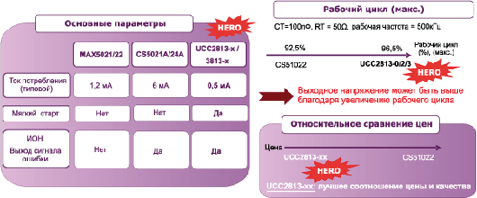 Сравнение с аналогами ШИМ-контроллеров UCC2813-xx показано на рисунке 11.