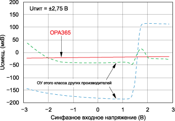 Прецизионный усилитель подразумевает точность и стабильность параметров усиления. Постоянство напряжения смещения ОУ очень важно для усиления сигнала с высокой точностью. Изменения напряжения смещения под воздействием входного синфазного напряжения для OPA365 и аналогичных усилителей этого класса других производителей показаны на рисунке 3. В большинстве случаев можно легко внести поправку для ошибки, вносимой напряжением смещения OPA365, и не беспокоиться о синфазной помехе на входе.