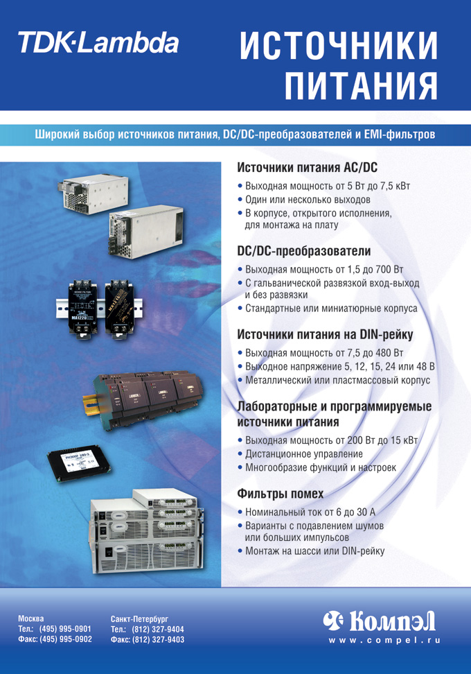 Я.Э.: Пользуйтесь нашим русскоязычным веб-ресурсом, используйте преимущества нашей квалифицированной технической поддержки. Пусть TDK-Lambda станет основным партнером в разработке электропитания для вашего изделия. Если вы не нашли в нашем ассортименте источник питания с необходимыми вам параметрами - обратитесь к вашему менеджеру по продажам, и мы внесем необходимые вам изменения.